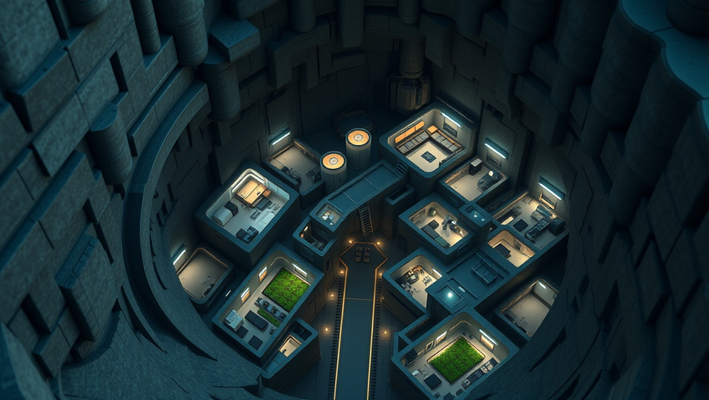 Imagina un entorno subterráneo donde cada unidad privada esté conectada a zonas comunes diseñadas para el ocio, el cultivo de alimentos, el tratamiento de agua, y el intercambio de recursos. Espacios con iluminación ambiental, sistemas inteligentes de control climático, y zonas de trabajo remoto completamente equipadas.